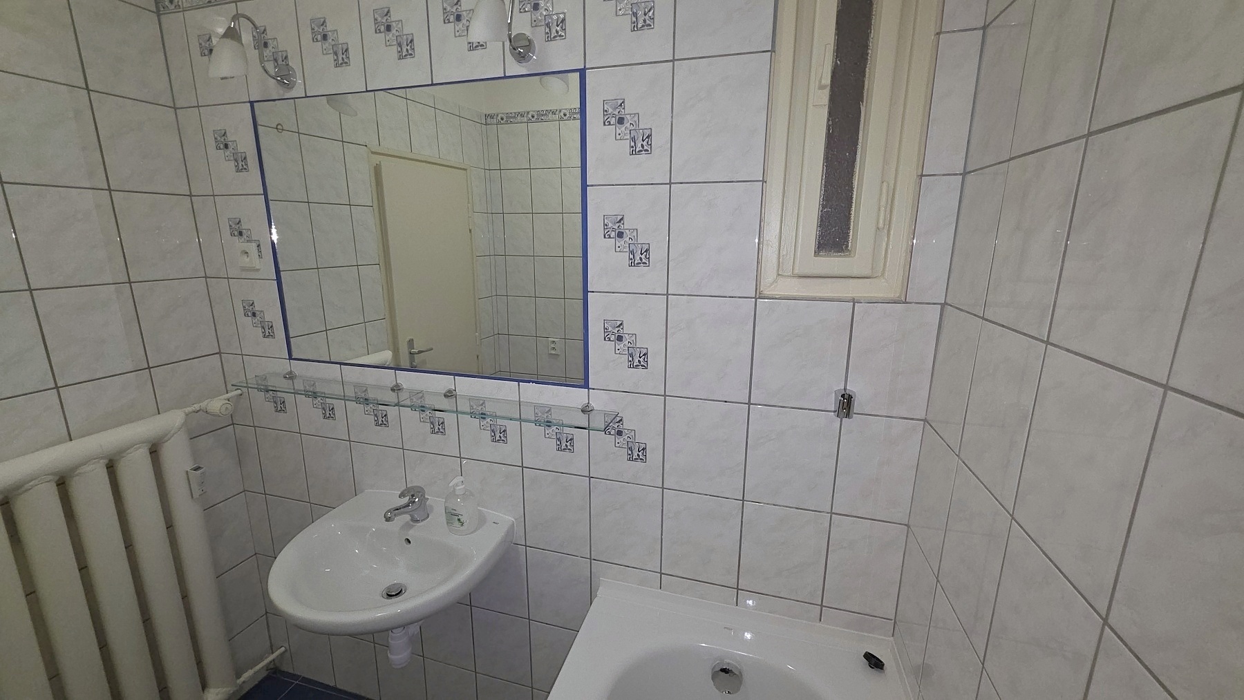 Koupelna je zařízena vanou, umyvadlem, zrcadlem a místem pro připojení pračky.