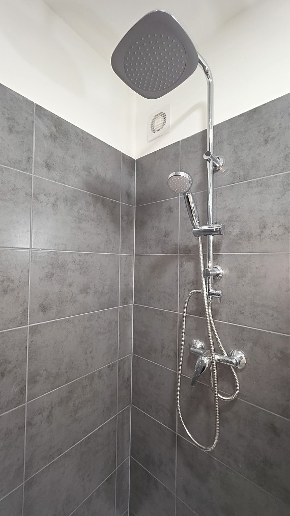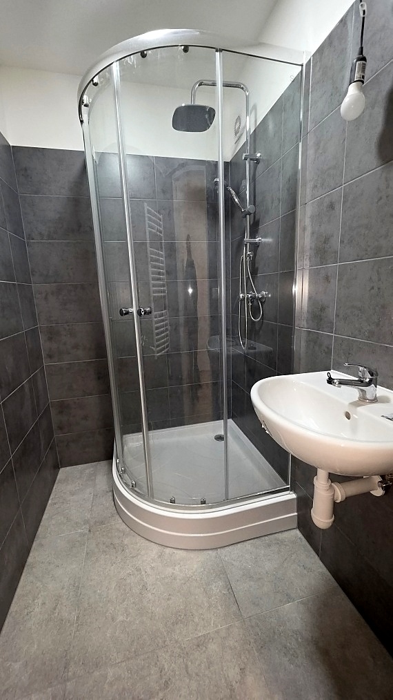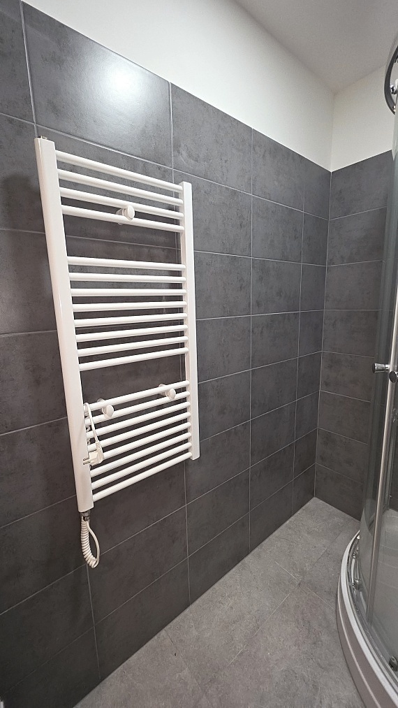 Koupelna je zařízena sprchou, umyvadlem a elektrickým topným žebříkem.