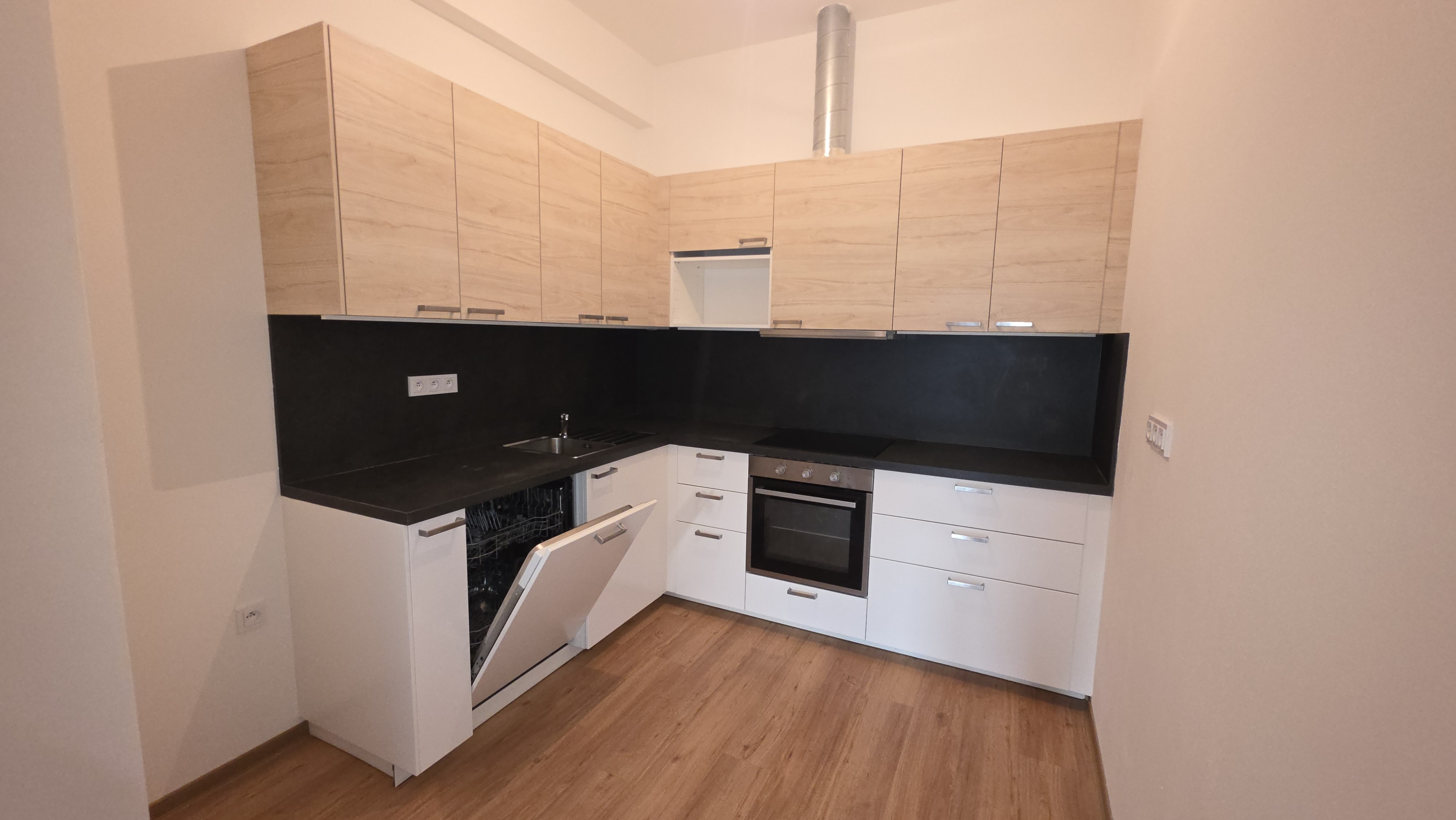 Kuchyňský kout je zařízen linkou s odtahovou digestoří, sklokeramickou varnou deskou, el. troubou a myčkou.