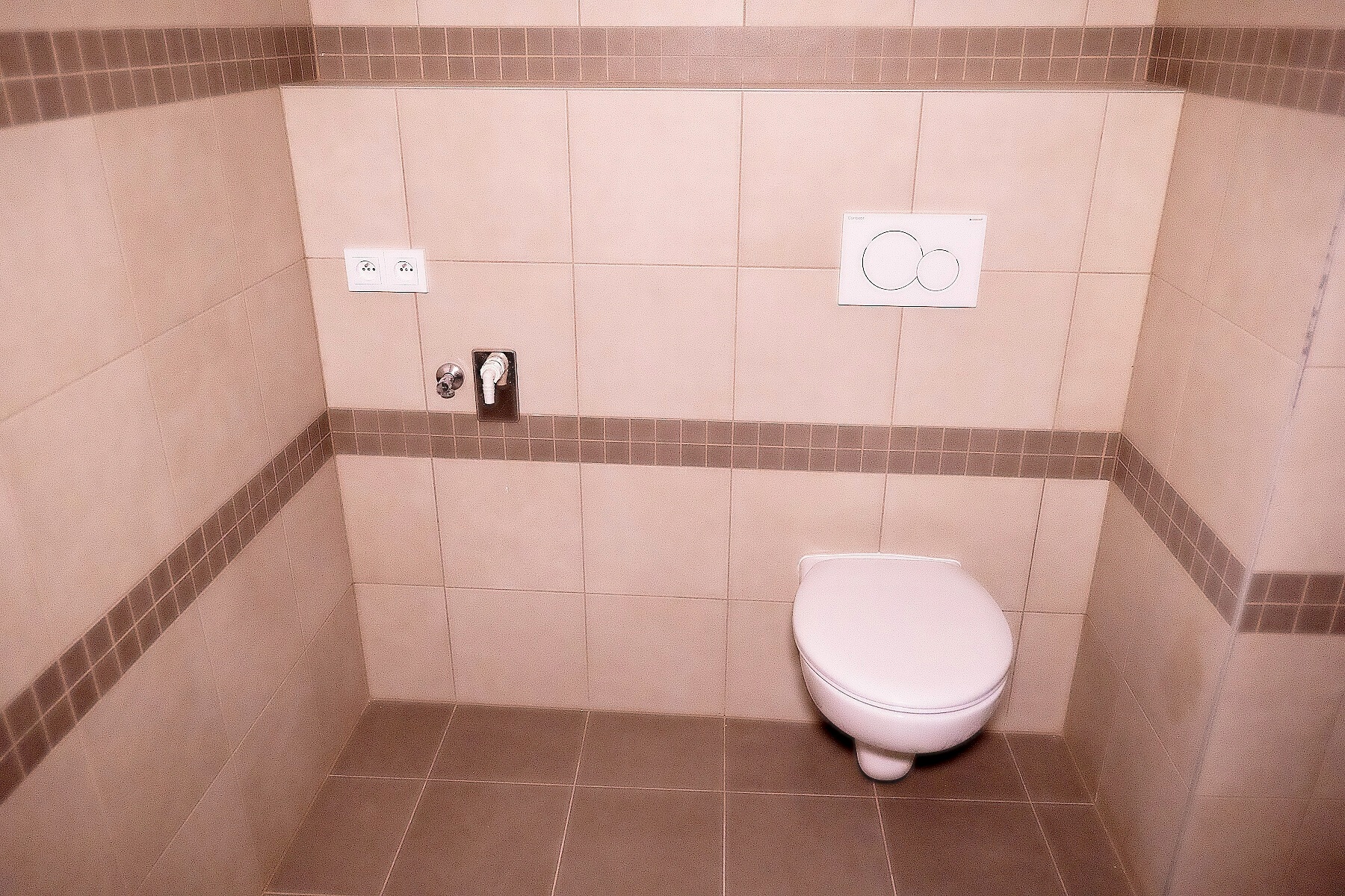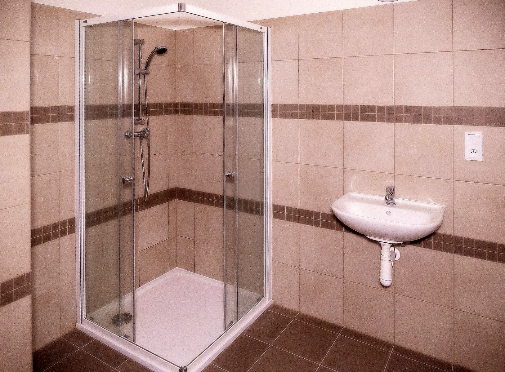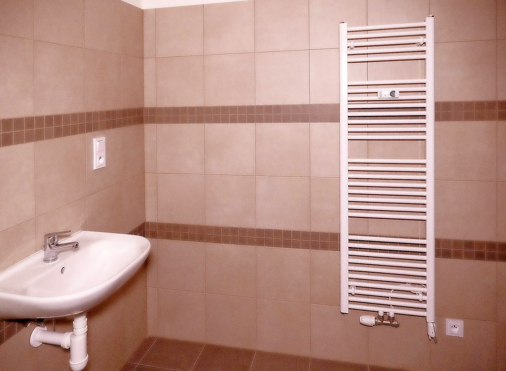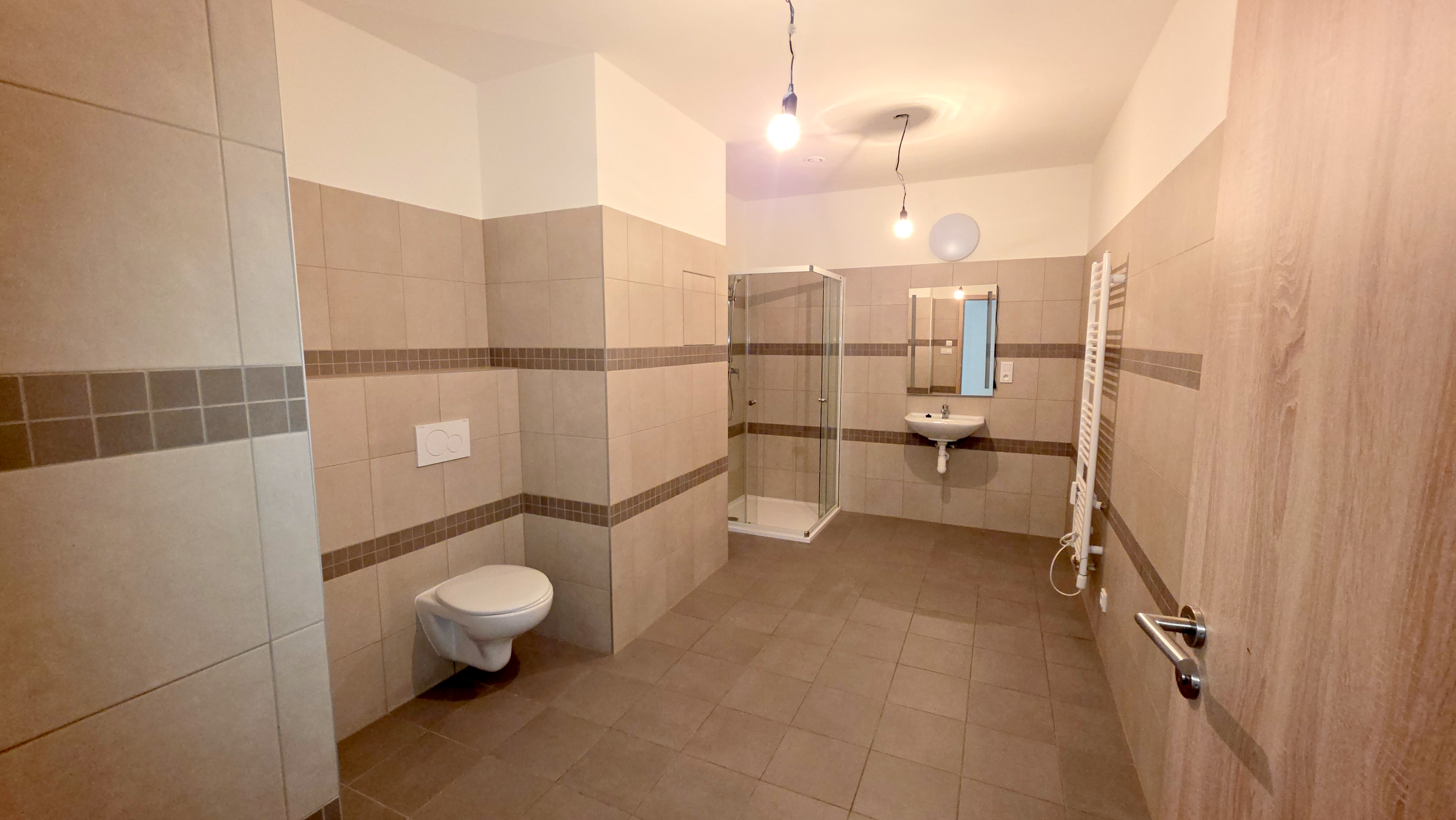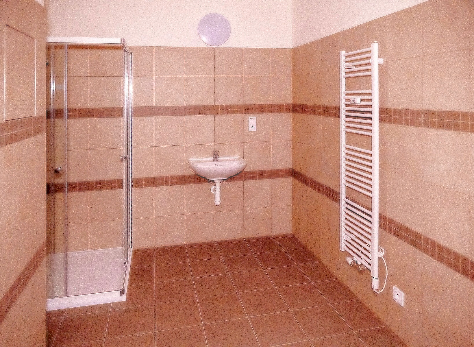 Koupelna je zařízena sprchou, umyvadlem, závěsným WC, kombinovaným. topným žebříkem a místem pro připojení pračky.