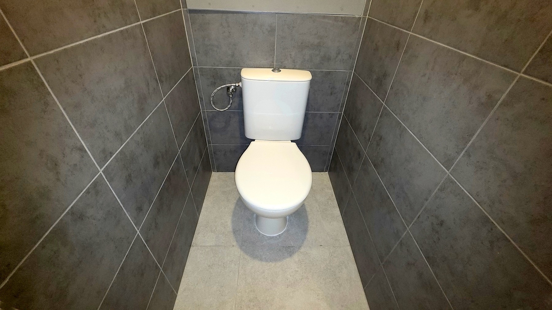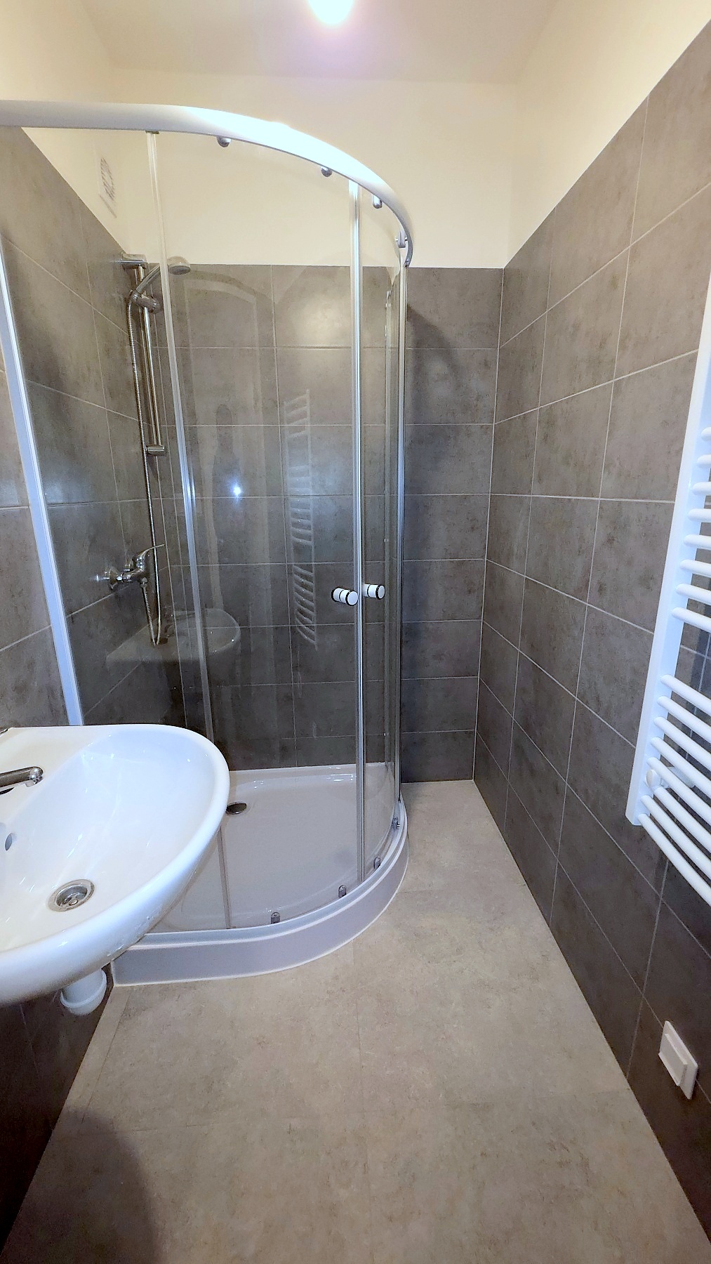 Koupelna je zařízena sprchou, umyvadlem a elektrickým topným žebříkem. V koupelně není místo pro pračku. WC je zařízeno kombi mísou.