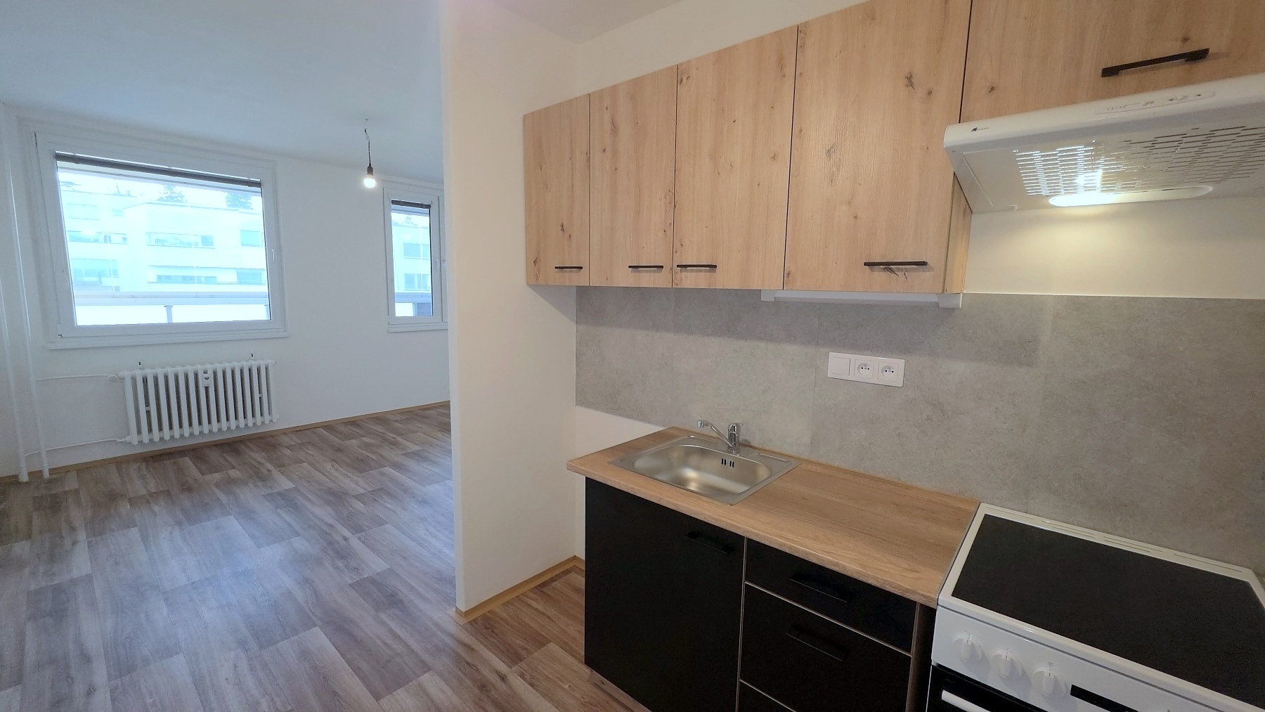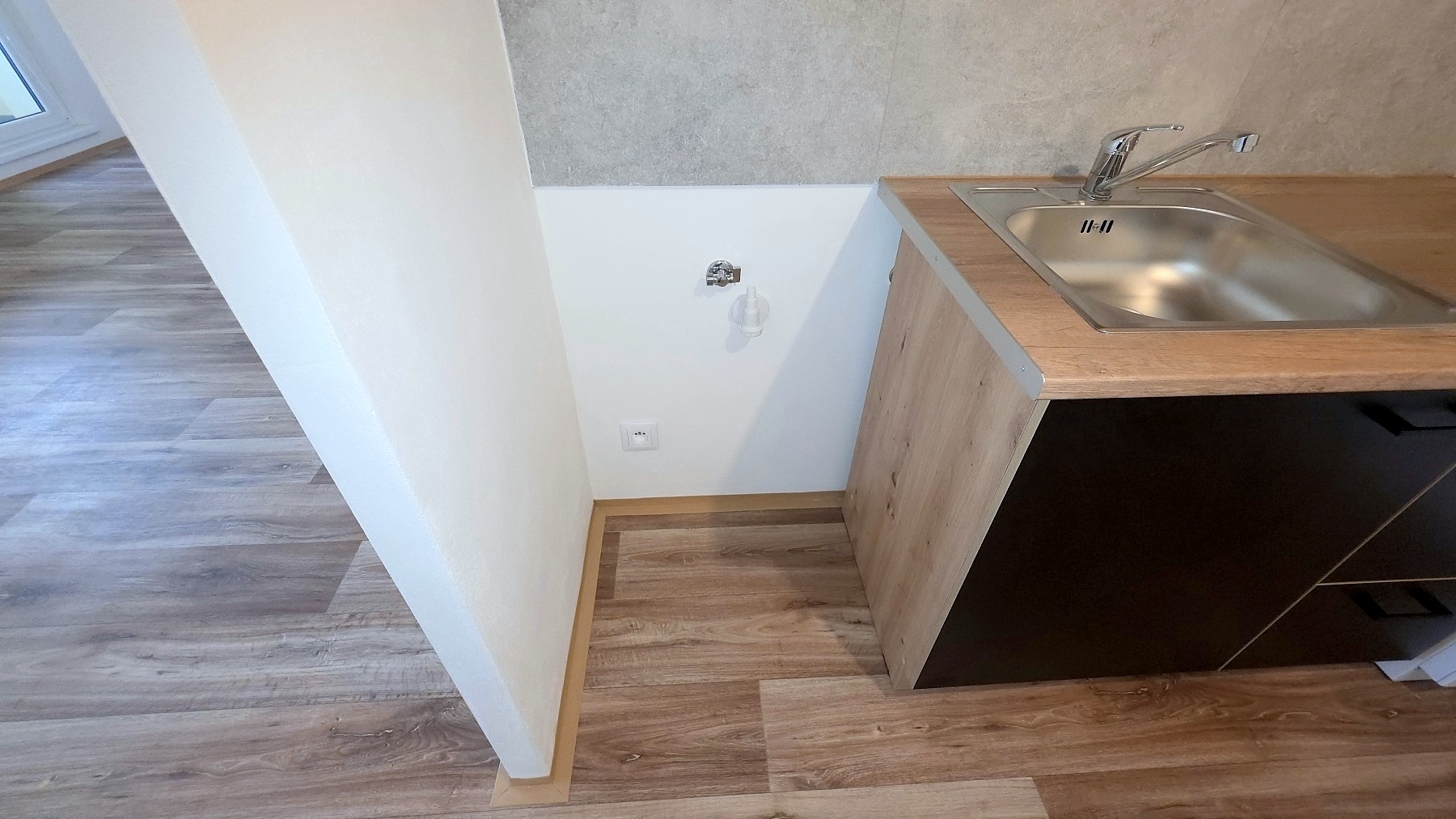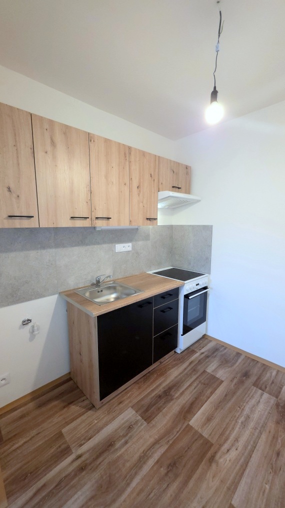 Kuchyňský kout je zařízen linkou s digestoří, sklokeramickou varnou deskou a el. troubou. Vedle linky je místo s připojením pro myčku nebo pračku.