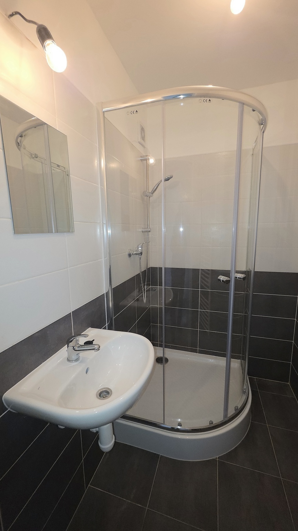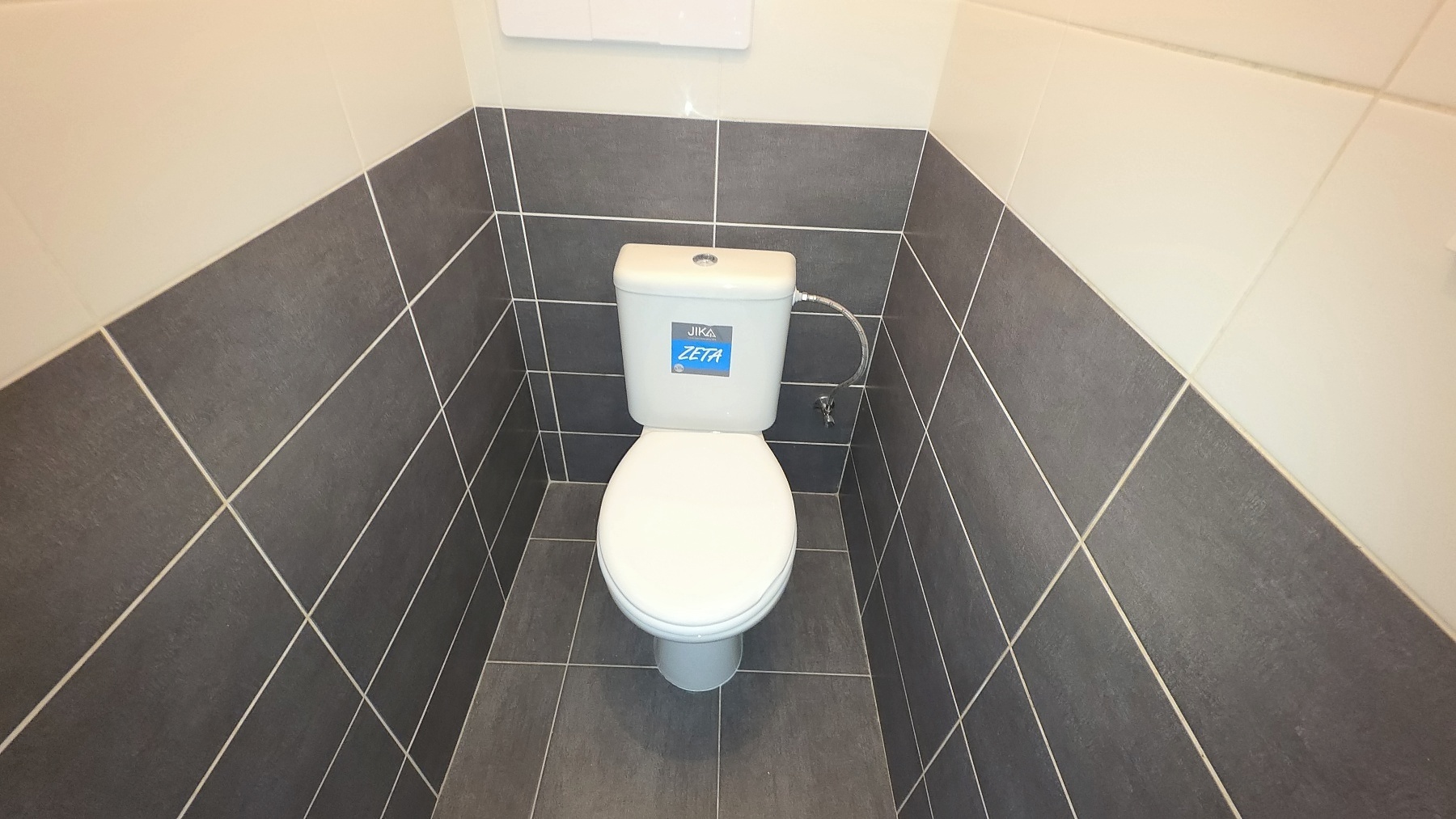 Koupelna je zařízena sprchou, umyvadlem a elektrickým topným žebříkem. V koupelně není místo pro pračku. WC je zařízeno kombi mísou.