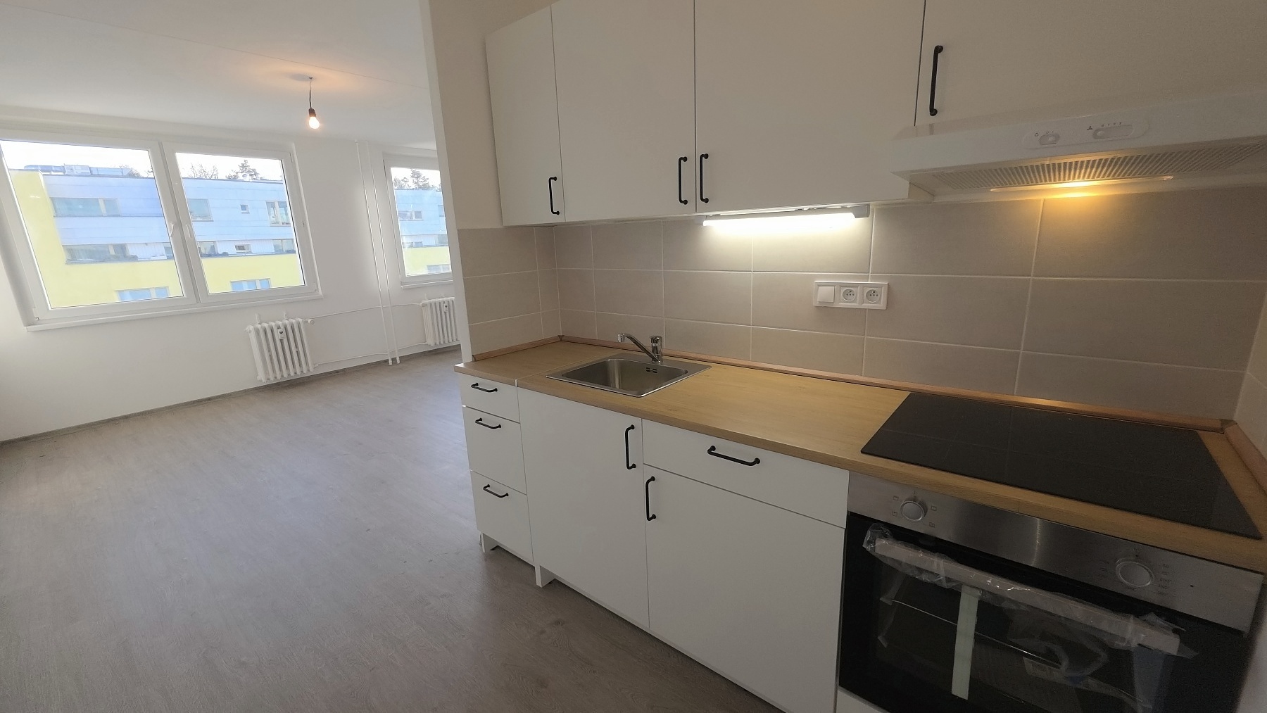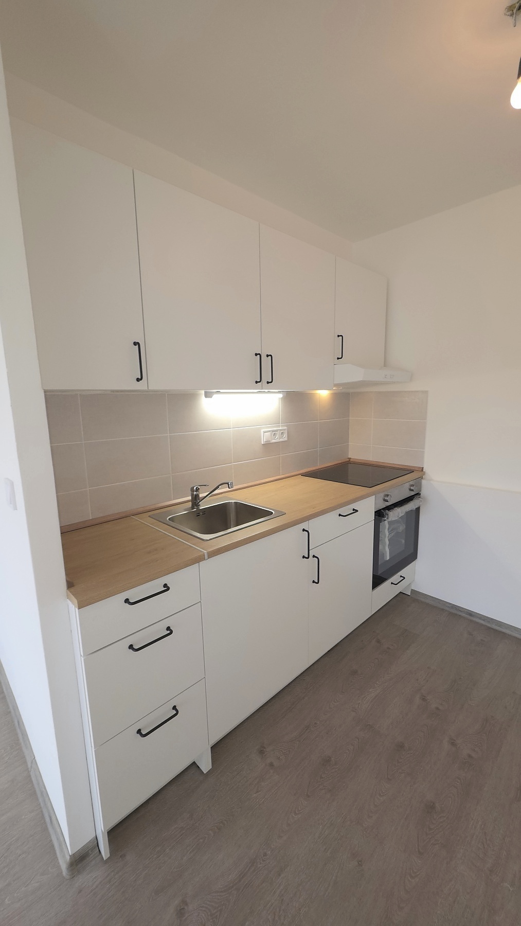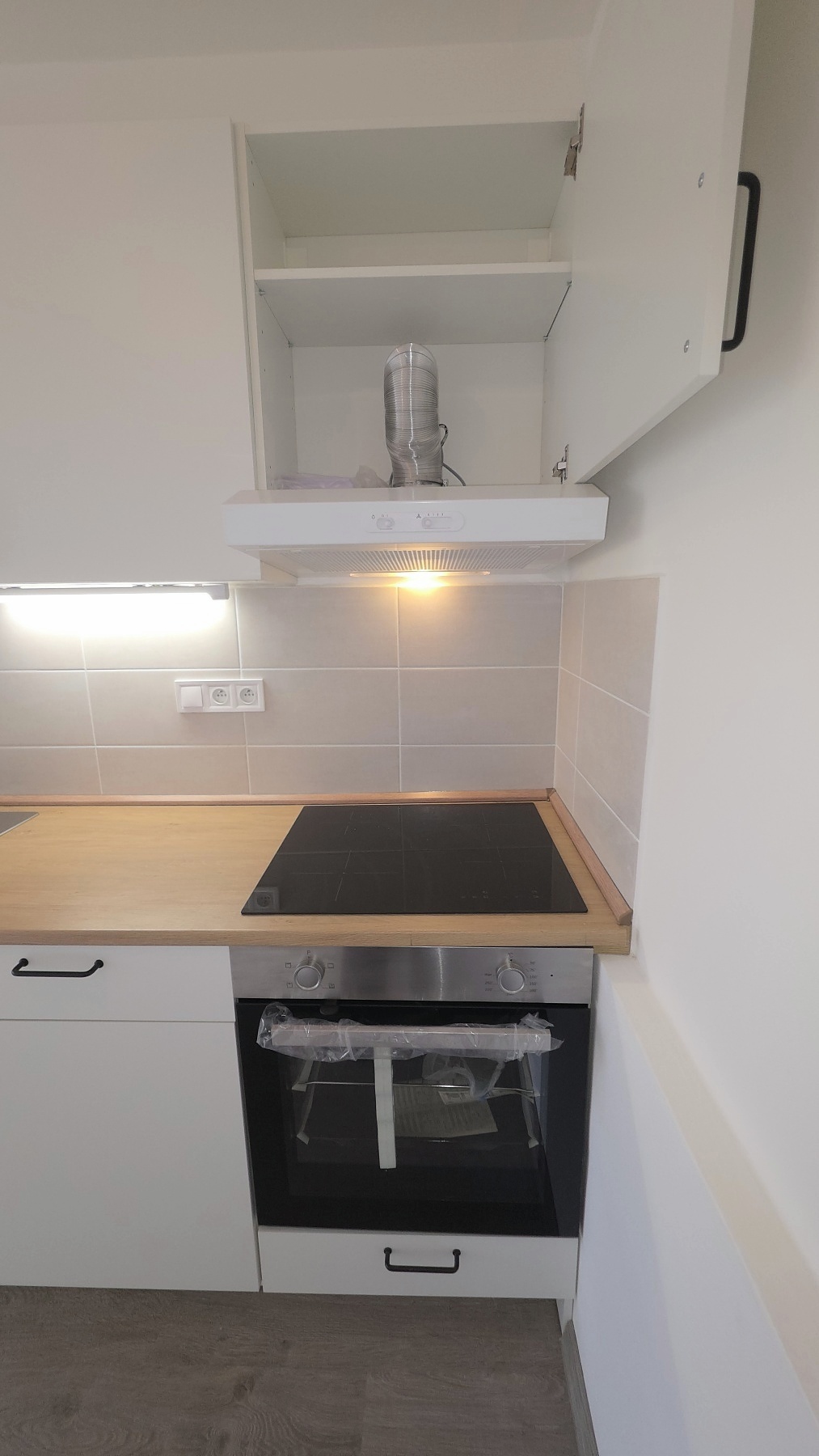 Kuchyňský kout je zařízen linkou s odtahovou digestoří, sklokeramickou varnou deskou a el. troubou.