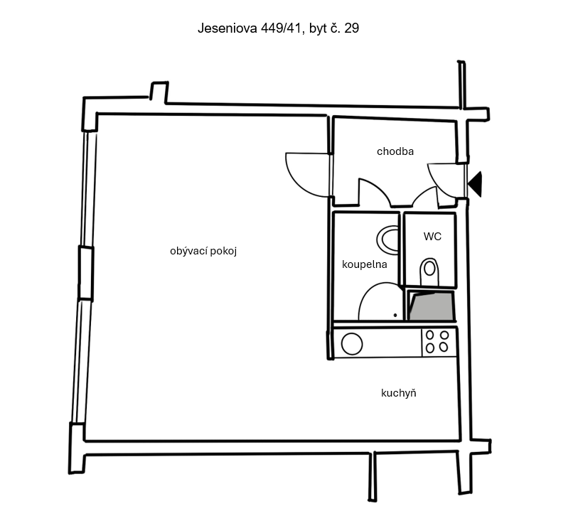 Dispozice: z chodby domu se vchází do předsíně, ze které jsou vstupy do dalších místností bytu. Okna bytu jsou orientovaná na jih do ulice Jeseniova.