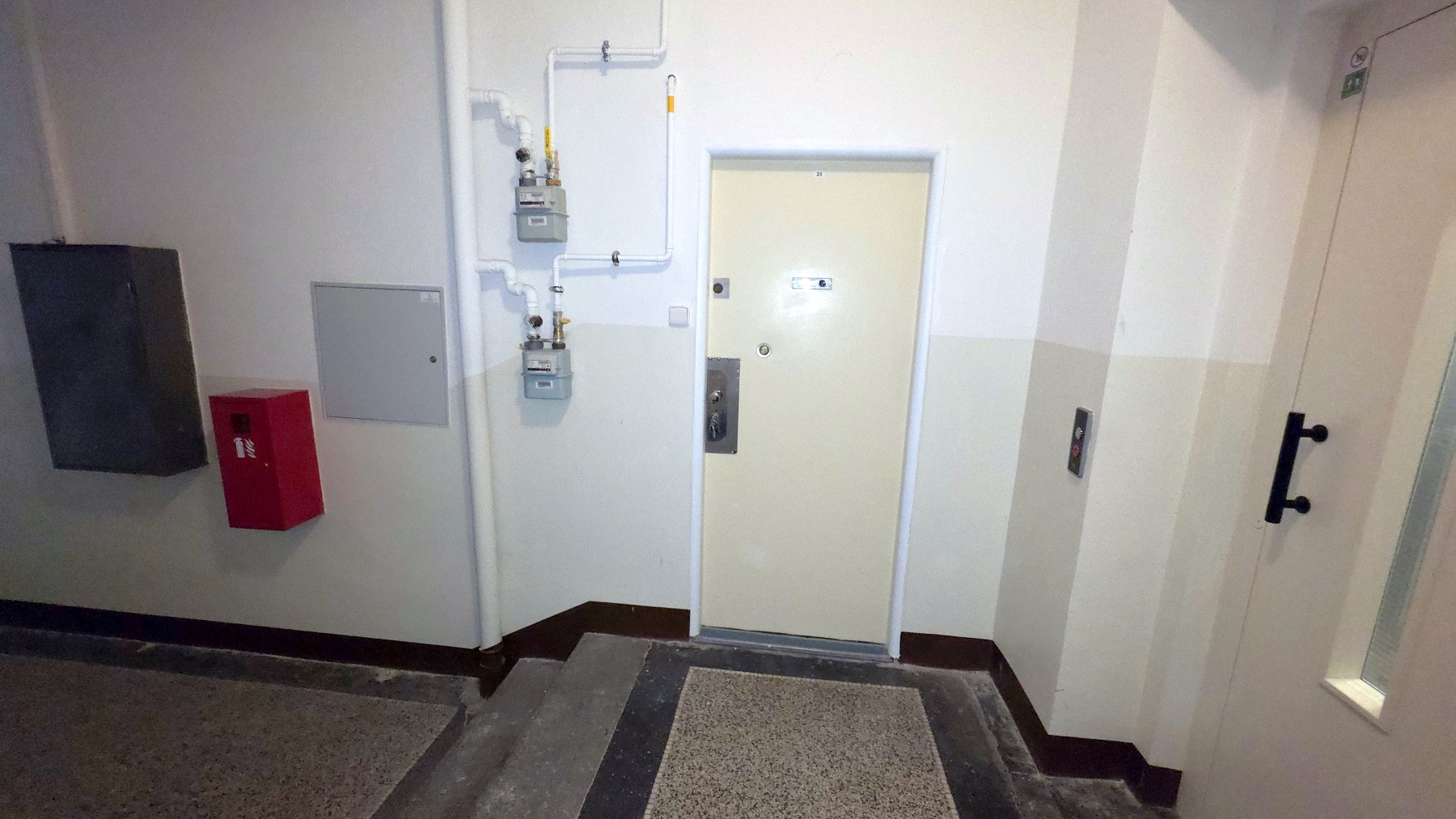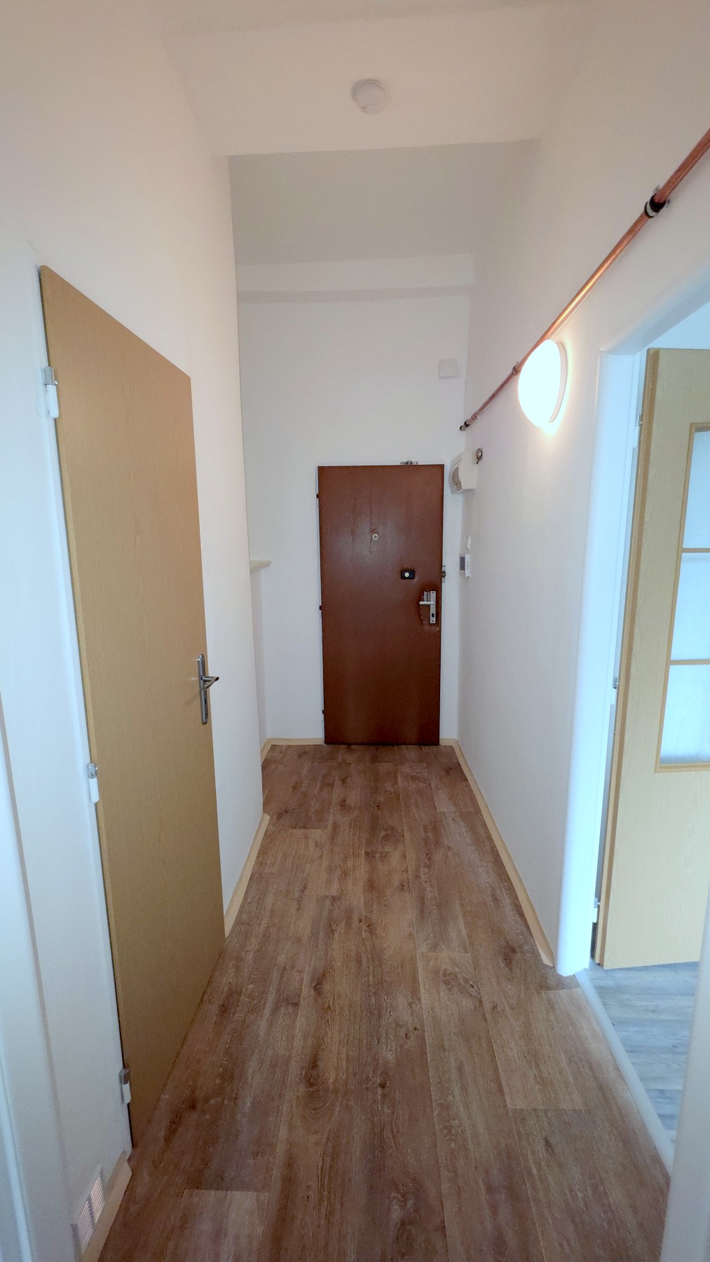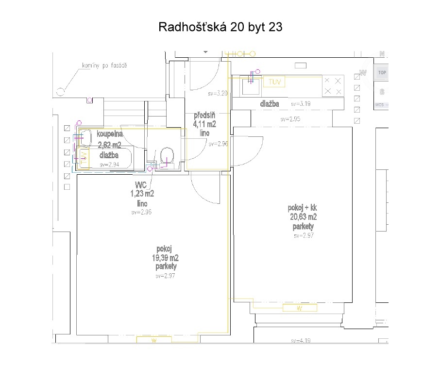 Dispozice: z chodby domu se vchází do předsíně, ze které jsou vstupy do dalších místností bytu. Orientace oken je na západ do ulice Radhošťská s průhledem do ulice Jagellonská.