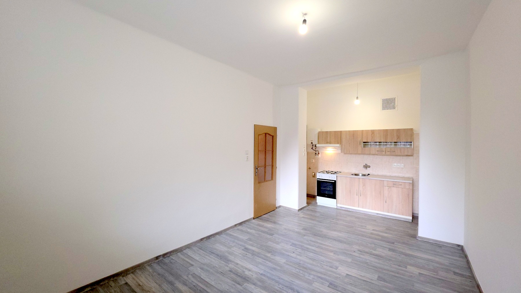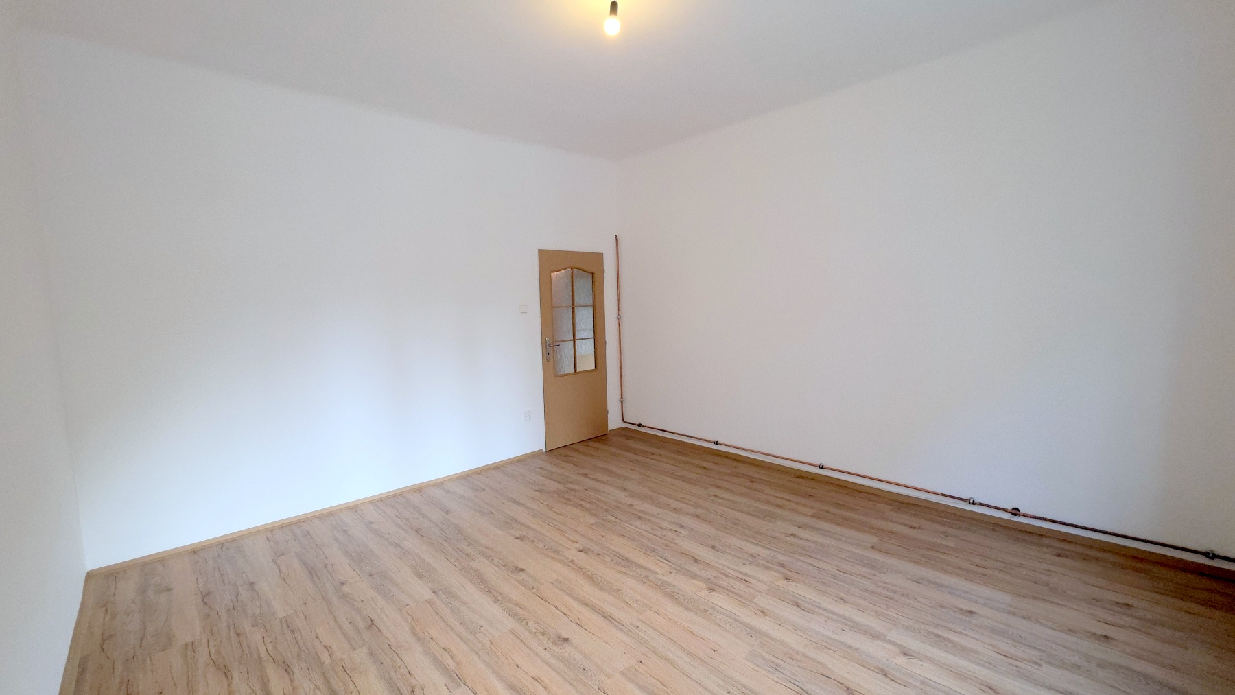 Podlahy: pokoj a kuchyň plovoucí laminátové, v chodbě vinylové, v koupelně s WC dlažba.