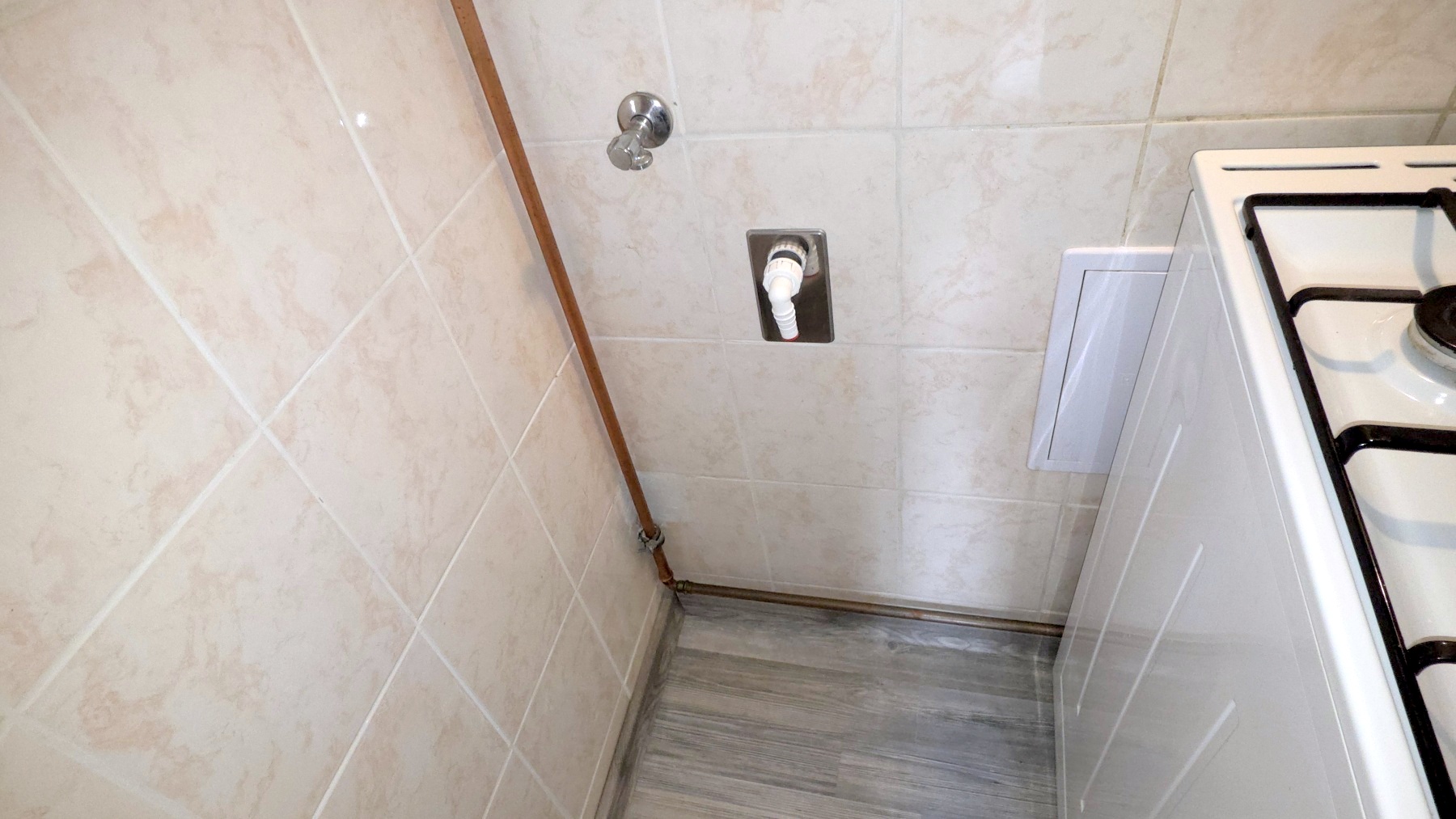 Kuchyňská linka je vybavená dřezem, digestoří, plynovým sporákem s plynovou troubou. Vedle linky je místo pro připojení myčky.