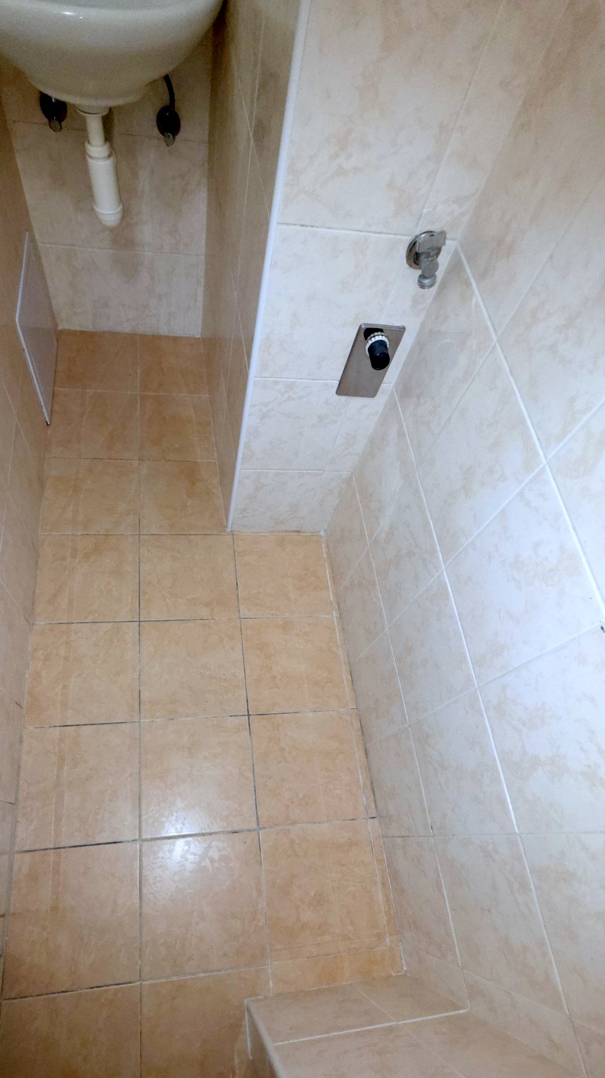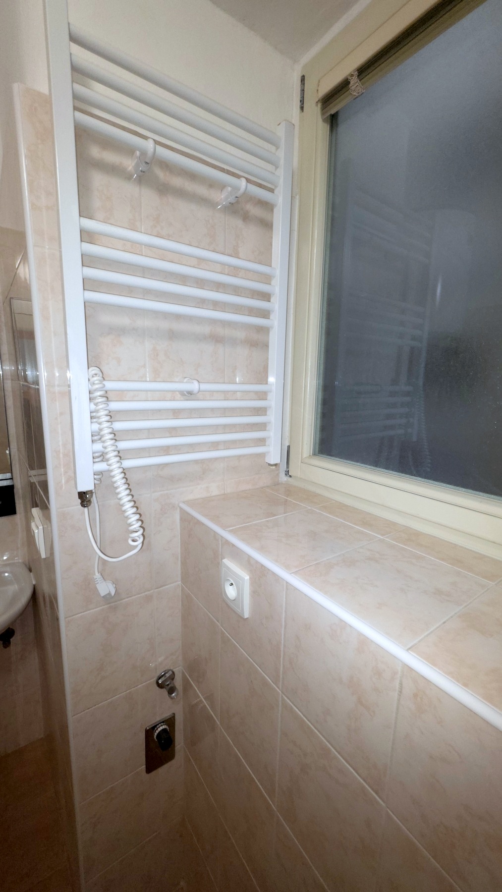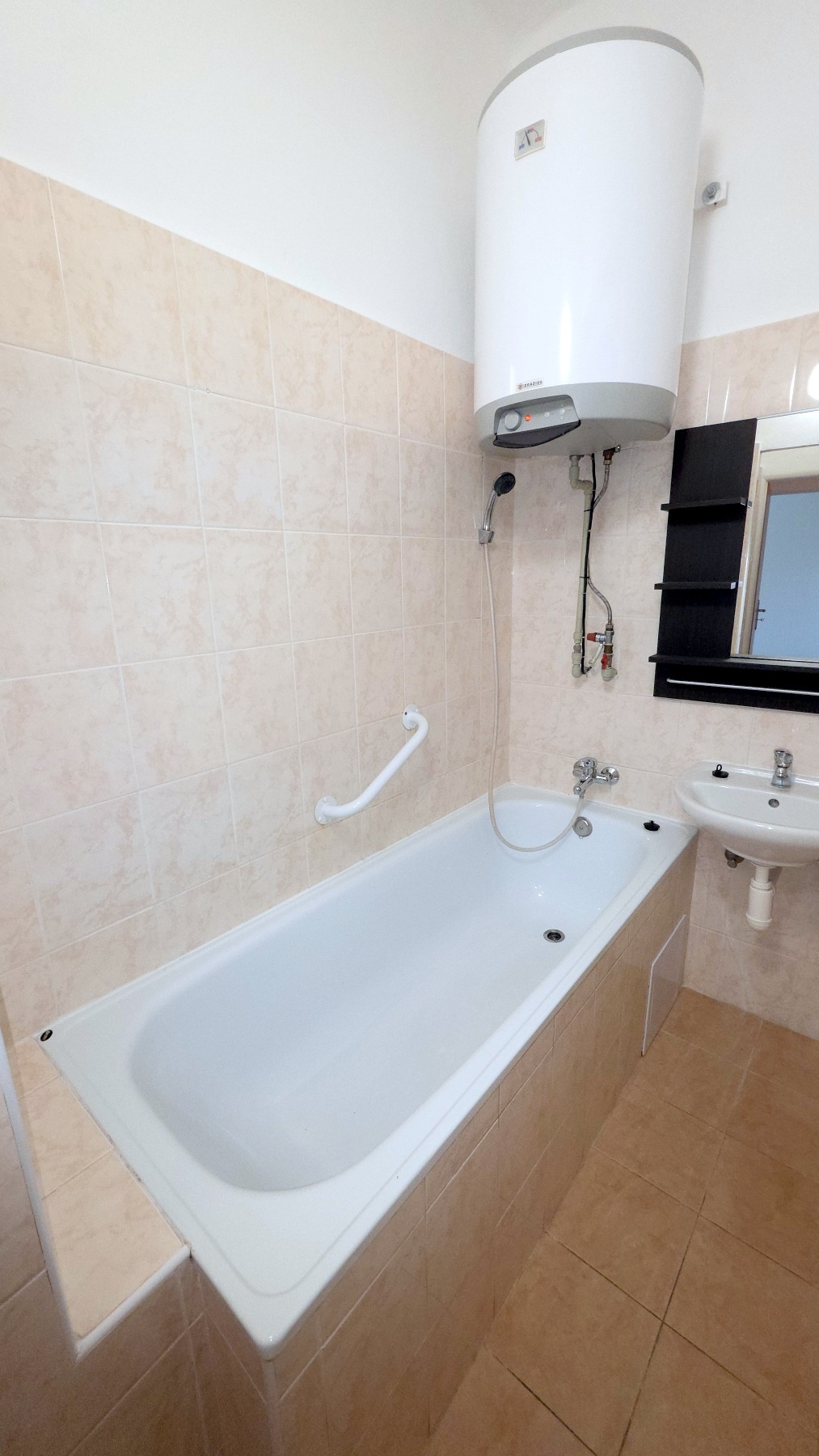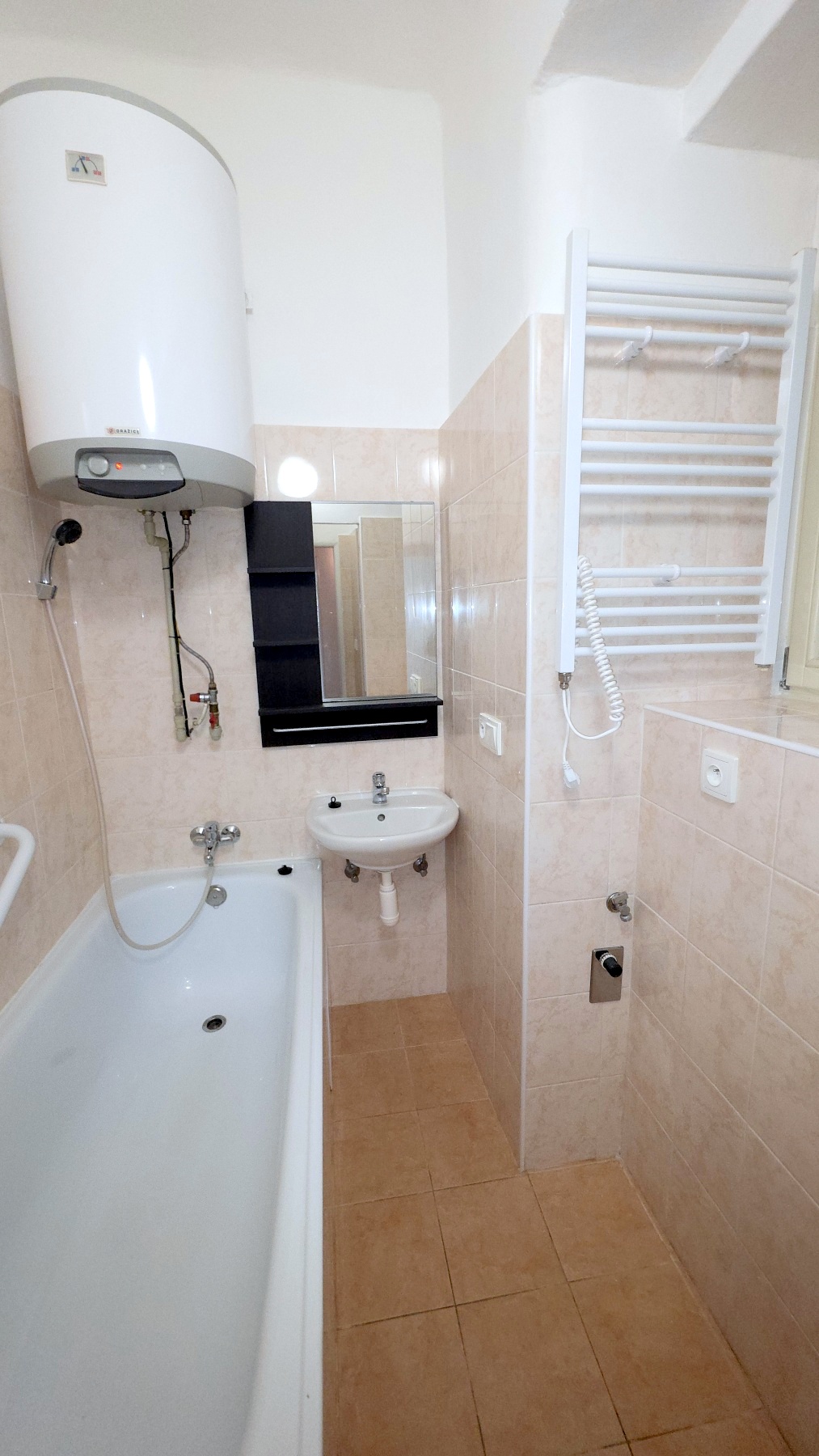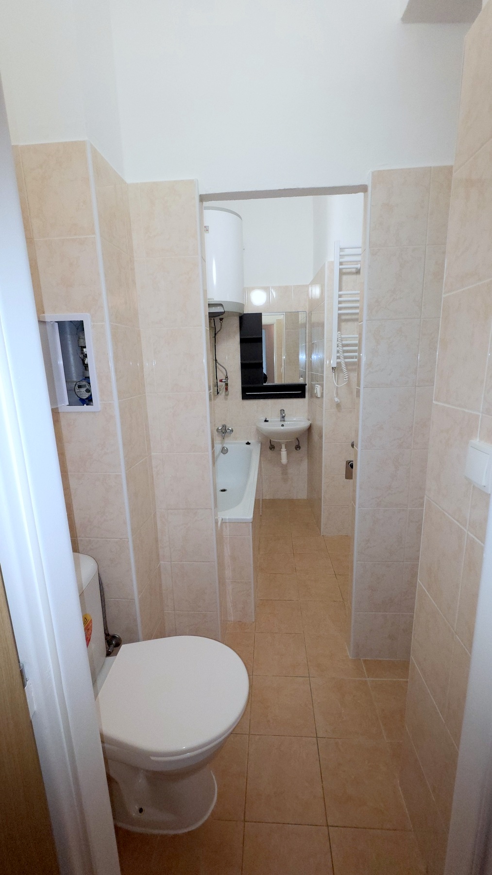 Koupelna se skládá ze dvou částí: za vstupem je kombi WC a v druhé části se nachází vana, el. bojler, umyvadlo, zrcadlo, el. topný žebřík a místo pro připojení pračky.