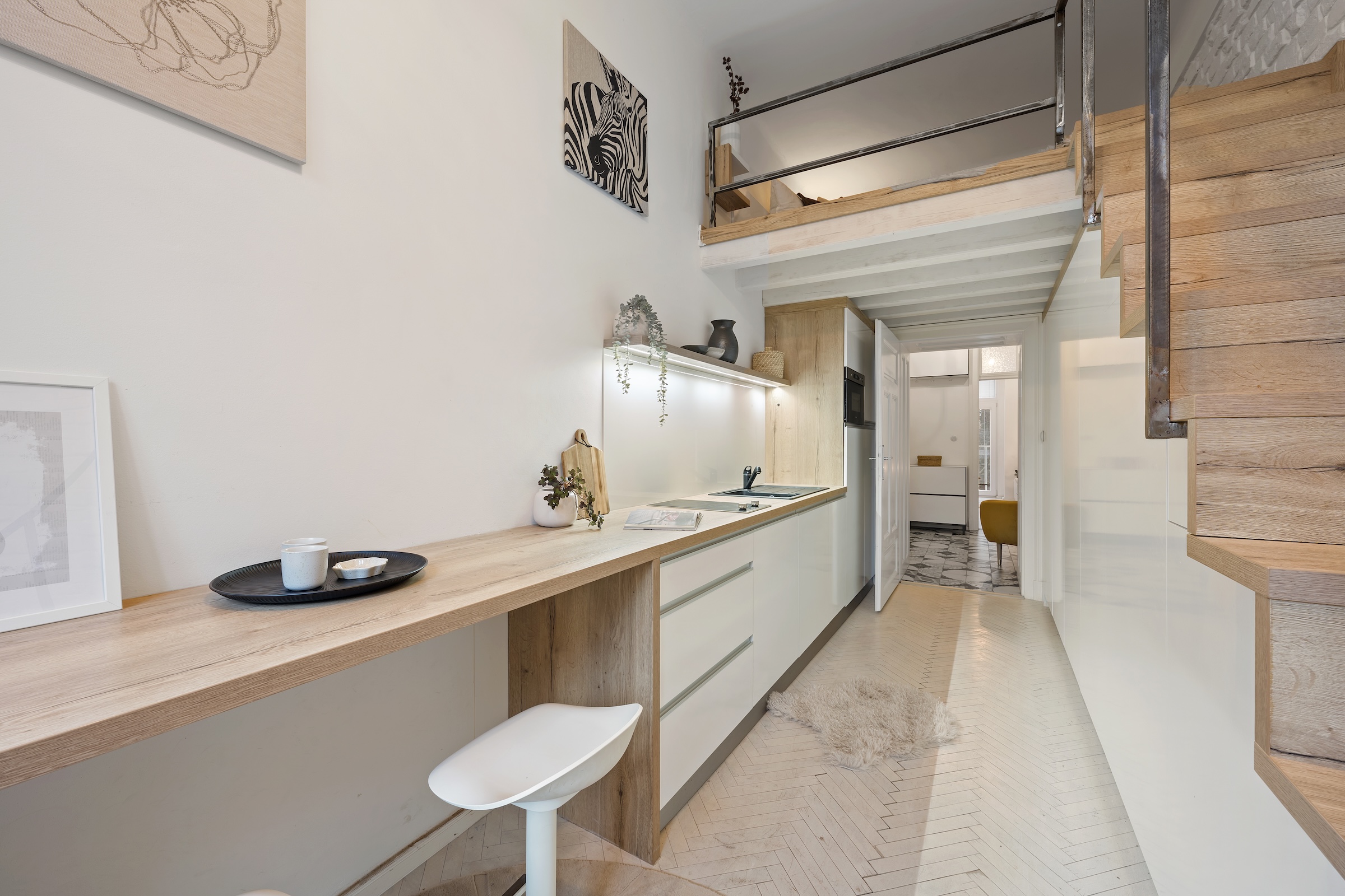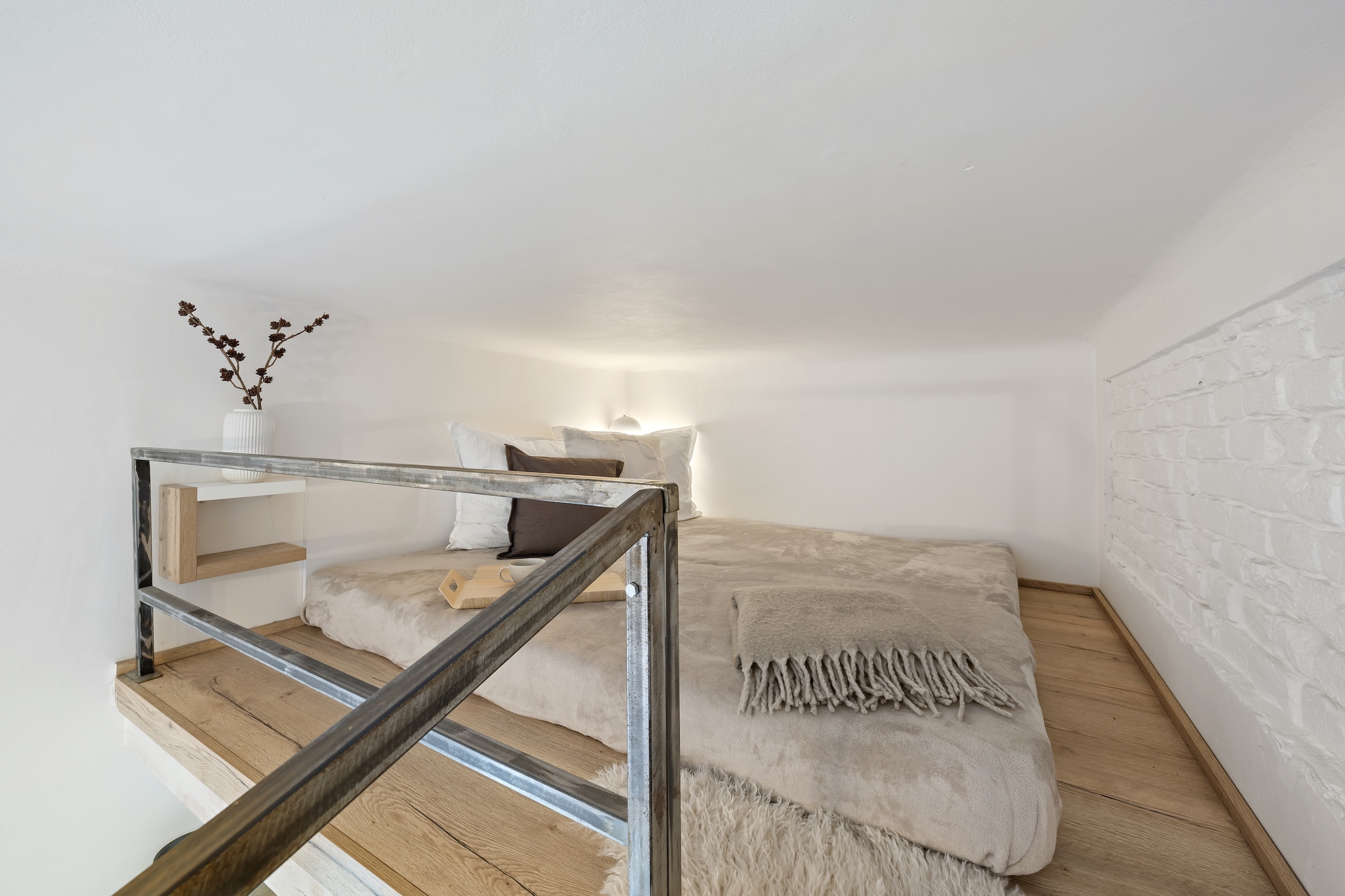 kuchyně 13,5 m2, pokoj 8,4 m2, koupelna 2 m2, předsíň bytu 6,4 m2, WC 0,8 m2 a galerie na spaní 5,4 m2.