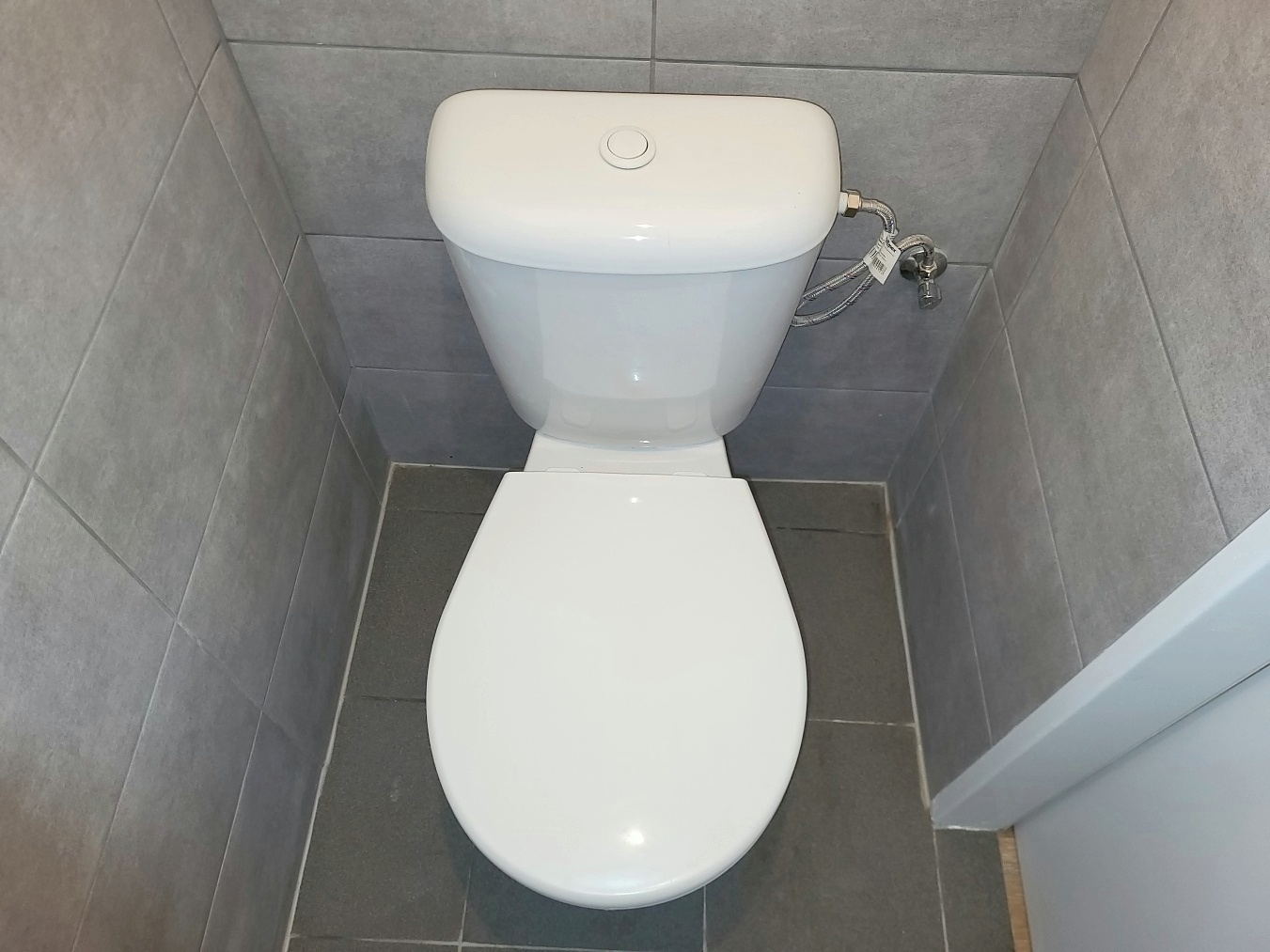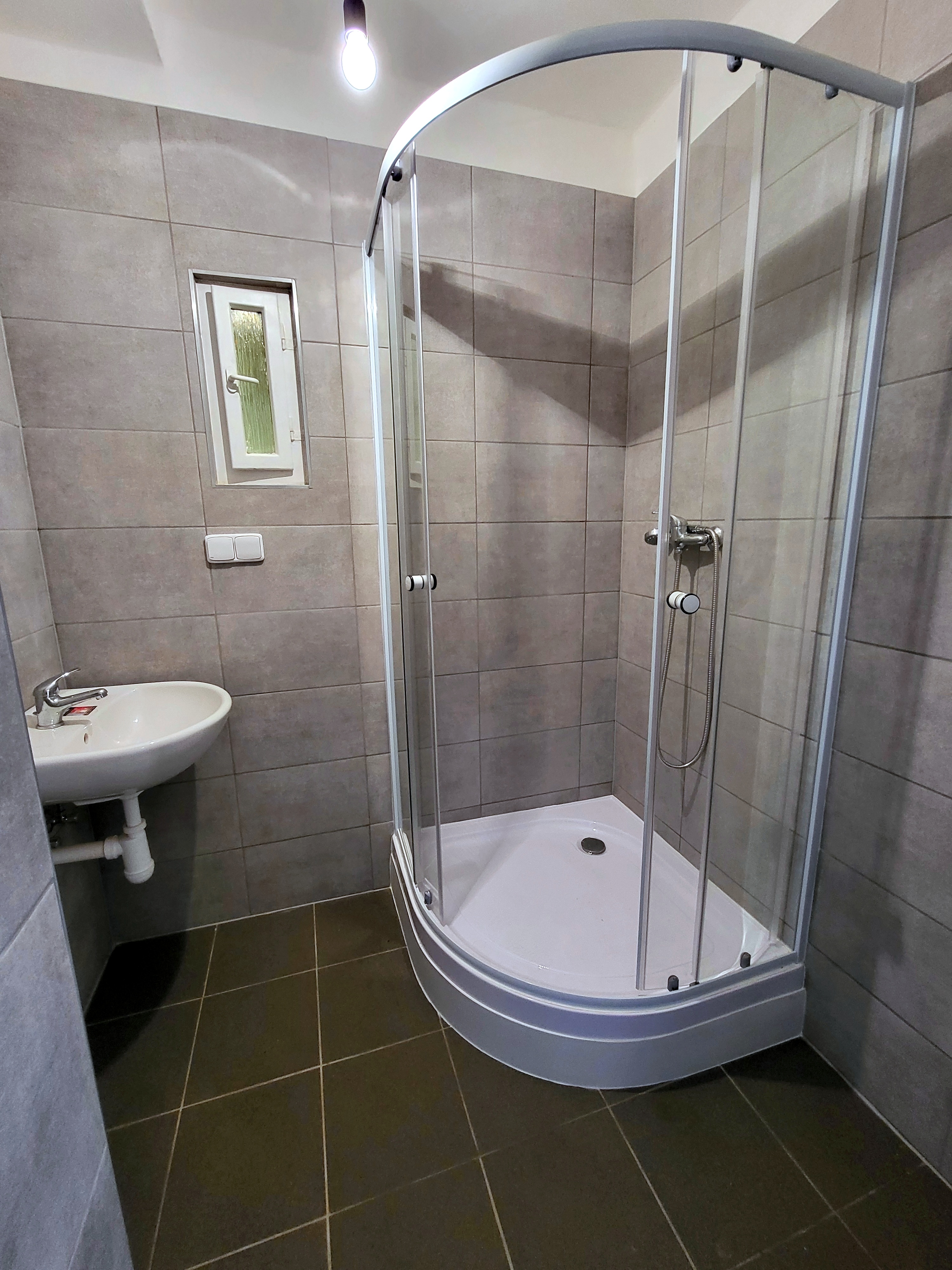 Koupelna je zařízena sprchou, umyvadlem, kombinovaným topným žebříkem a místem pro připojení pračky. Samostatné WC je zařízeno kombi mísou.