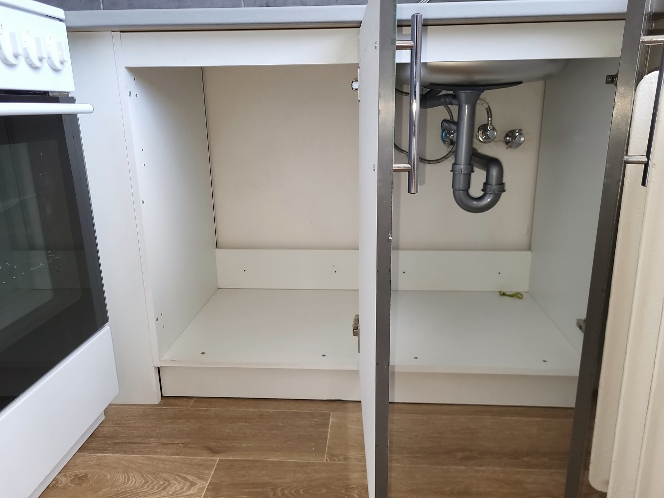 Kuchyňská linka je vybavena dřezem, digestoří, elektrickým sporákem se sklokeramickou deskou a troubou. V lince je místo pro vestavnou myčku a příprava na její připojení, vedle linky je místo pro lednici.