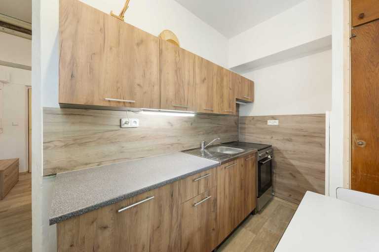 Kuchyňská linka je zařízena digestoří a elektrickým sporákem s troubou. Vedle linky je místo pro připojení myčky.