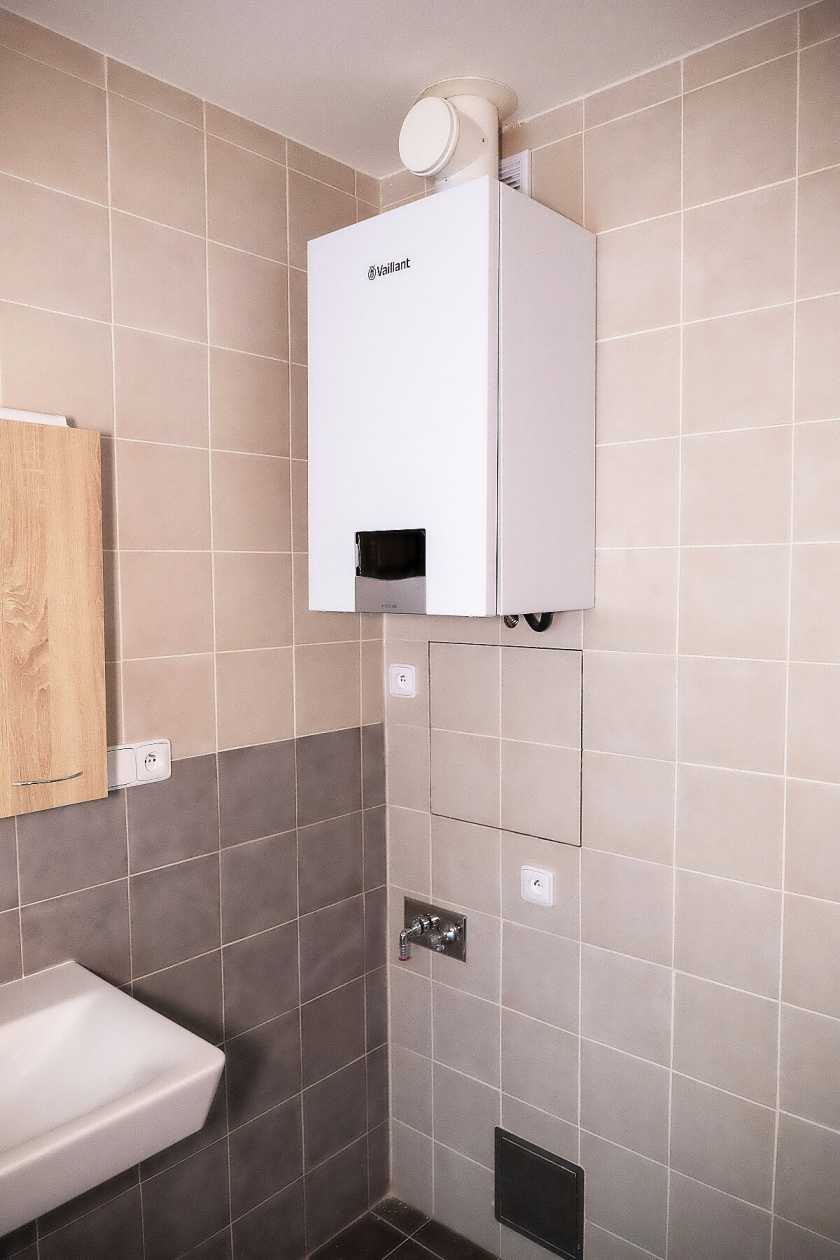 Topení a teplá voda jsou zajištěny kombinovaným plynovým kotlem, který je v koupelně.