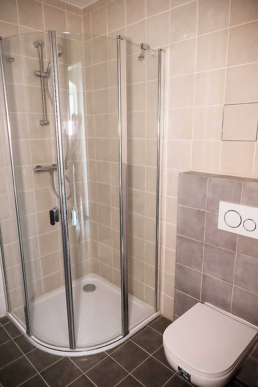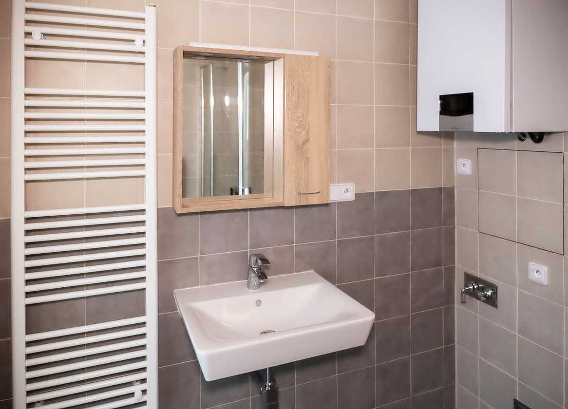 Kuchyňská linka je vybavena plynovou varnou deskou, horkovzdušnou elektrickou troubou, odtahovou digestoří a přípravou pro myčku. Koupelna je zařízena sprchou, umyvadlem, zrcadlovou galerií, kombinovaným topným žebříkem, místem pro připojení pračky a závěsným WC.