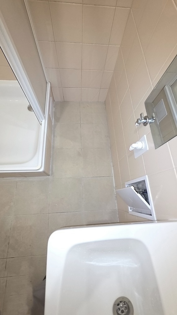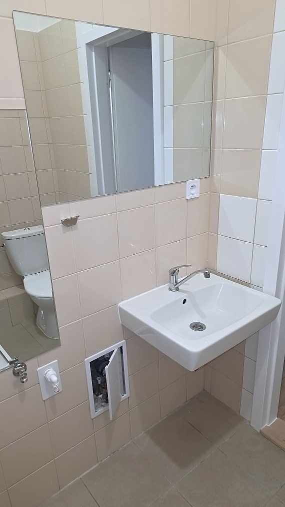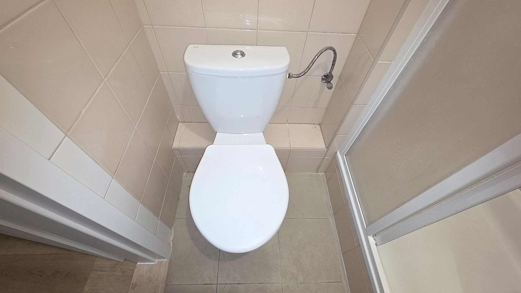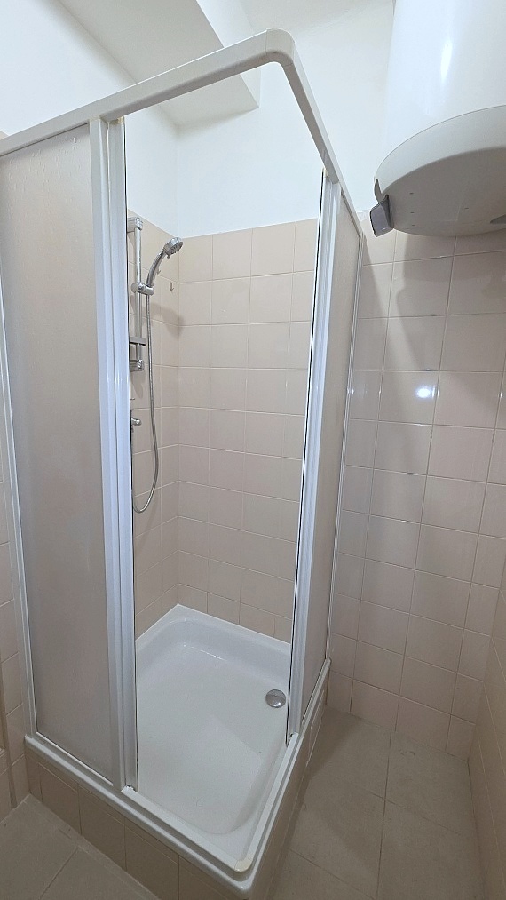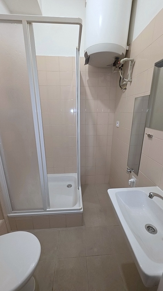 Koupelna je zařízena WC, sprchovým koutem, umyvadlem, zrcadlem, místem pro připojení úzké pračky a el. bojlerem.