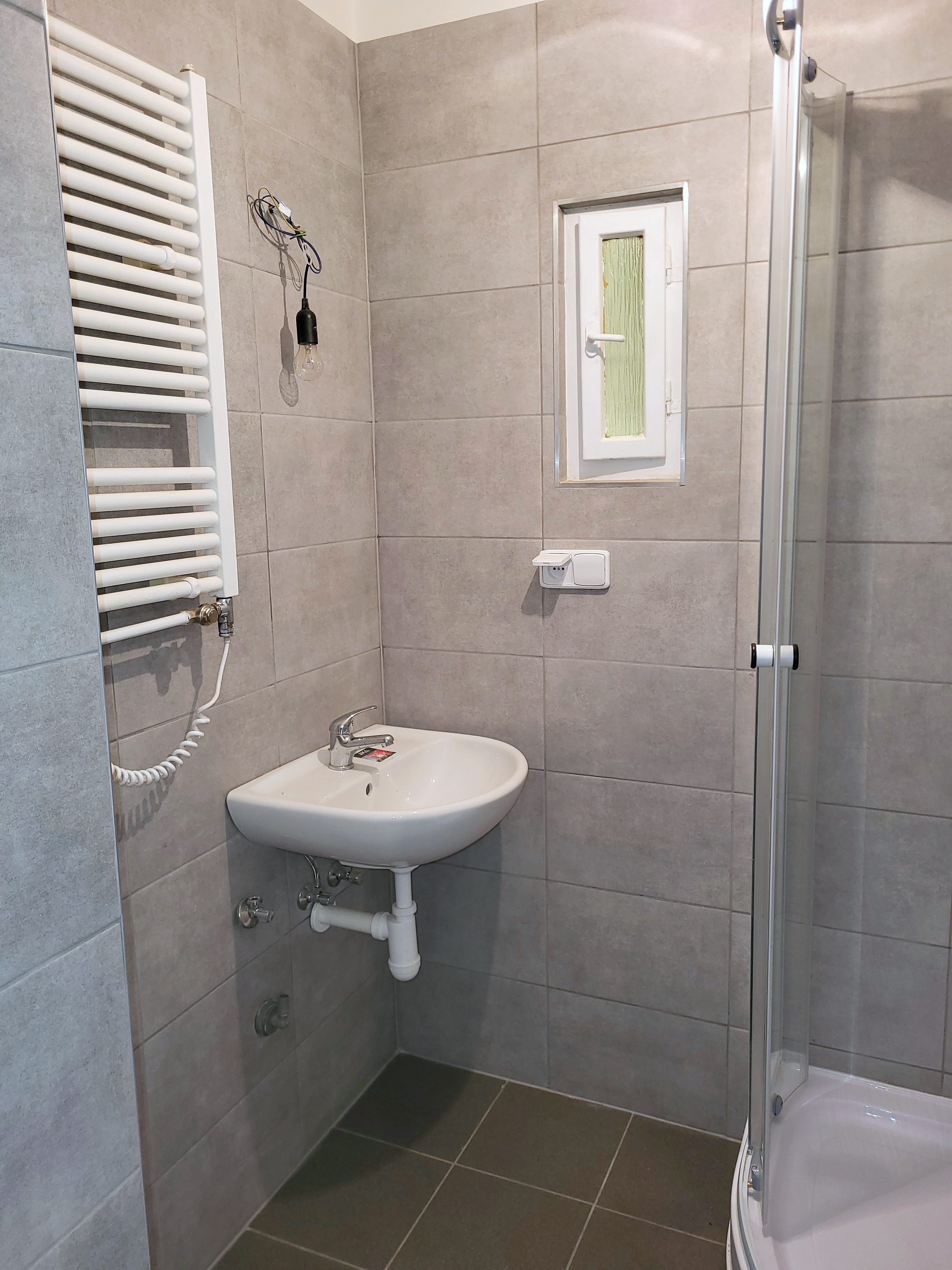 Koupelna je zařízena sprchou, umyvadlem, kombinovaným topným žebříkem a místem pro připojení pračky. Samostatné WC je zařízeno kombi mísou.