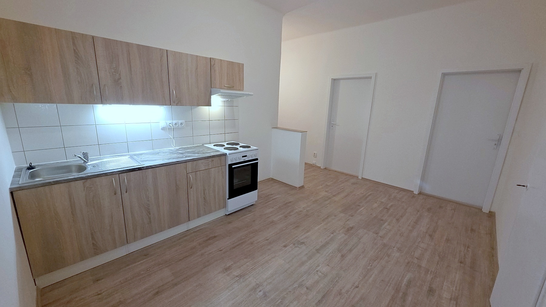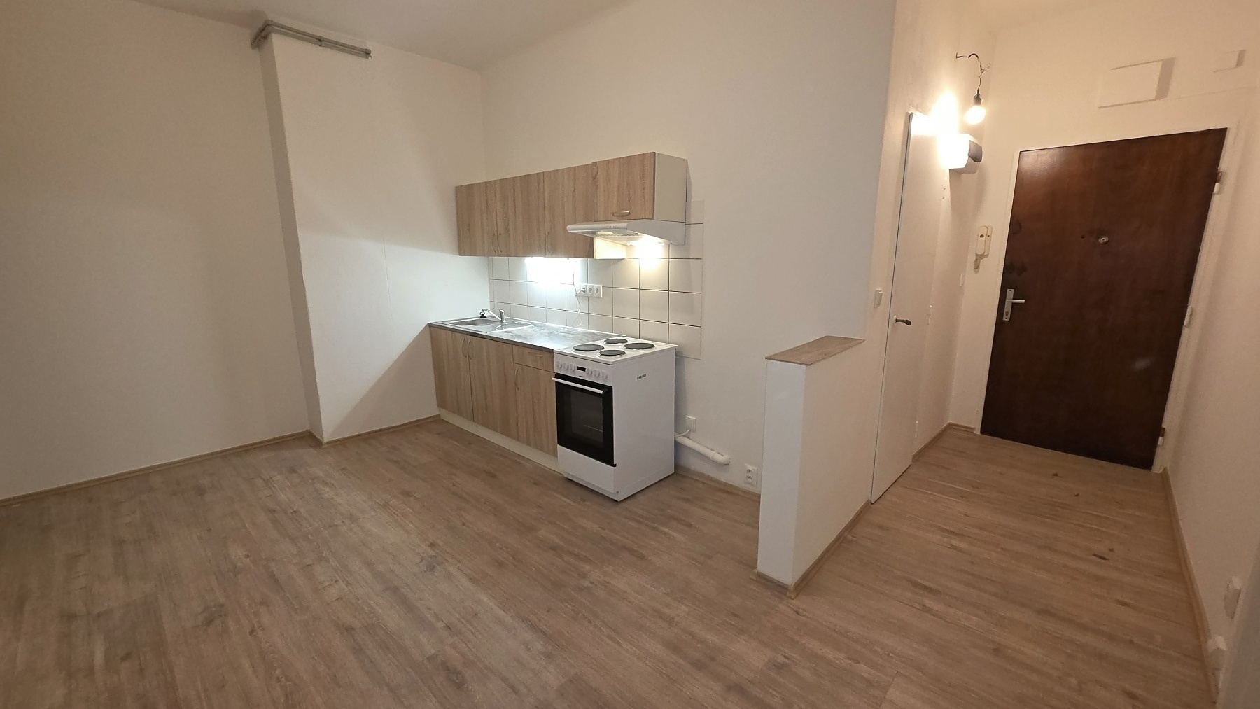 V hale se nachází kuchyňská linka, která je vybavena dřezem, elektrickým sporákem s troubou a digestoří. Koupelna je zařízena vanou, umyvadlem, zrcadlem, radiátorem a místem pro připojení pračky. WC je vybaveno kombi mísou.